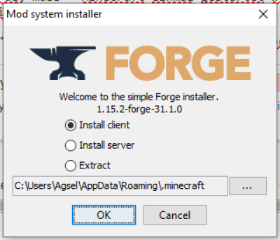 Im Anschluss wird “Minecraft-Forge” installiert. Hierzu wird die vom TS heruntergeladene Version ausgeführt (doppelklick). Die Option “Install client” wird hierbei ausgewählt. (Die Installation kann etwas dauern)
